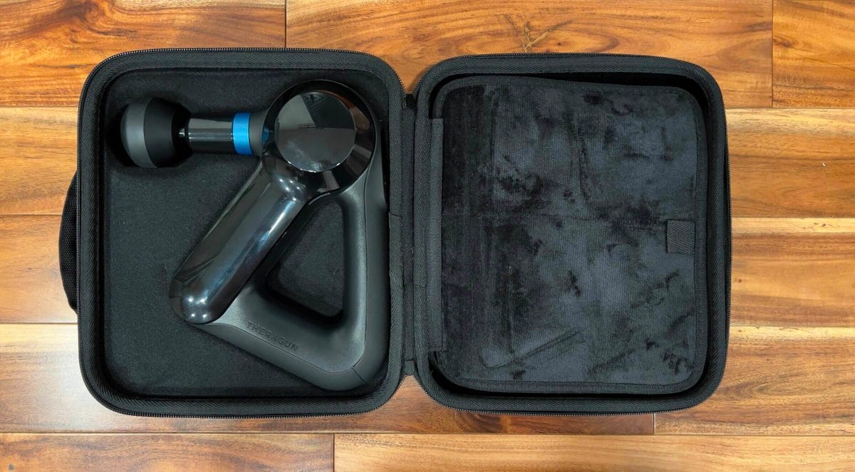 I had gotten used to the flimsy carrying case that came with the Exogun, so I was surprised by the sturdiness of Theragun’s. It’s not heavy, but it feels like it would protect the device if you accidentally dropped it. The inside of the case has a divider and two compartments to store all of the accessories.